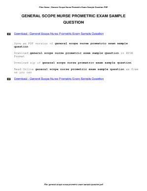 Download general scope nurse prometric exam sample question Epub online is a convenient and frugal way to read general scope nurse prometric exam sample question you love right from the comfort of your own home. Yes, there sites where you can get Epub "for free" but the ones listed below are clean from viruses and completely legal to use.
